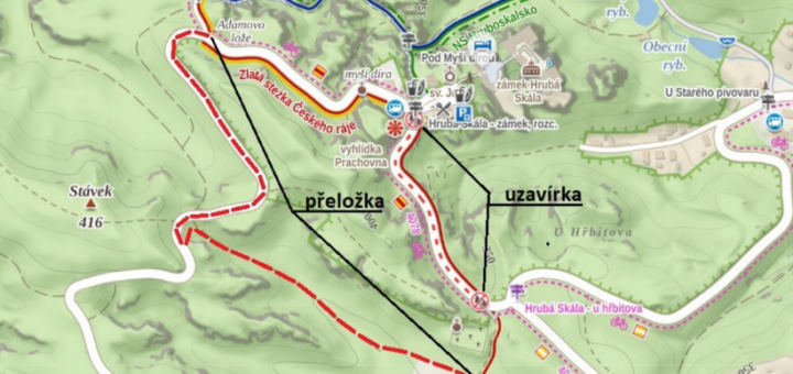 Z důvodu rekonstrukce silnice III/27921 v obci Hrubá Skála, bude v termínu od 9.4. do 30.9.2026 uzavřený úsek od zámku Hrubá Skála ke křižovatce u hřbitova pro veškerý provoz. Červená turistická značená trasa je dočasně přeložena dle přiloženého obrázku.