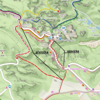 Z důvodu rekonstrukce silnice III/27921 v obci Hrubá Skála, bude v termínu od 9.4. do 30.9.2026 uzavřený úsek od zámku Hrubá Skála ke křižovatce u hřbitova pro veškerý provoz. Červená turistická značená trasa je dočasně přeložena dle přiloženého obrázku.