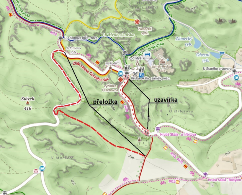 Červená turistická značená trasa je dočasně přeložena dle přiloženého obrázku.